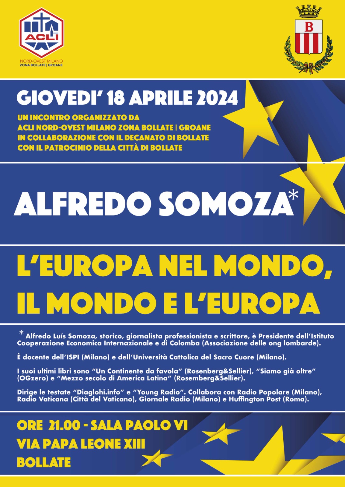 Le Acli della zona Bollate-Groane vi invitano giovedì 18 aprile alle 21, presso l’aula Paolo VI di via Leone XIII a Bollate, a un incontro sull’Europa e il suo posto nel mondo che vedrà la gradita presenza di Alfredo Somoza, storico, giornalista e docente. Nella locandina allegata trovate tutte le informazioni.