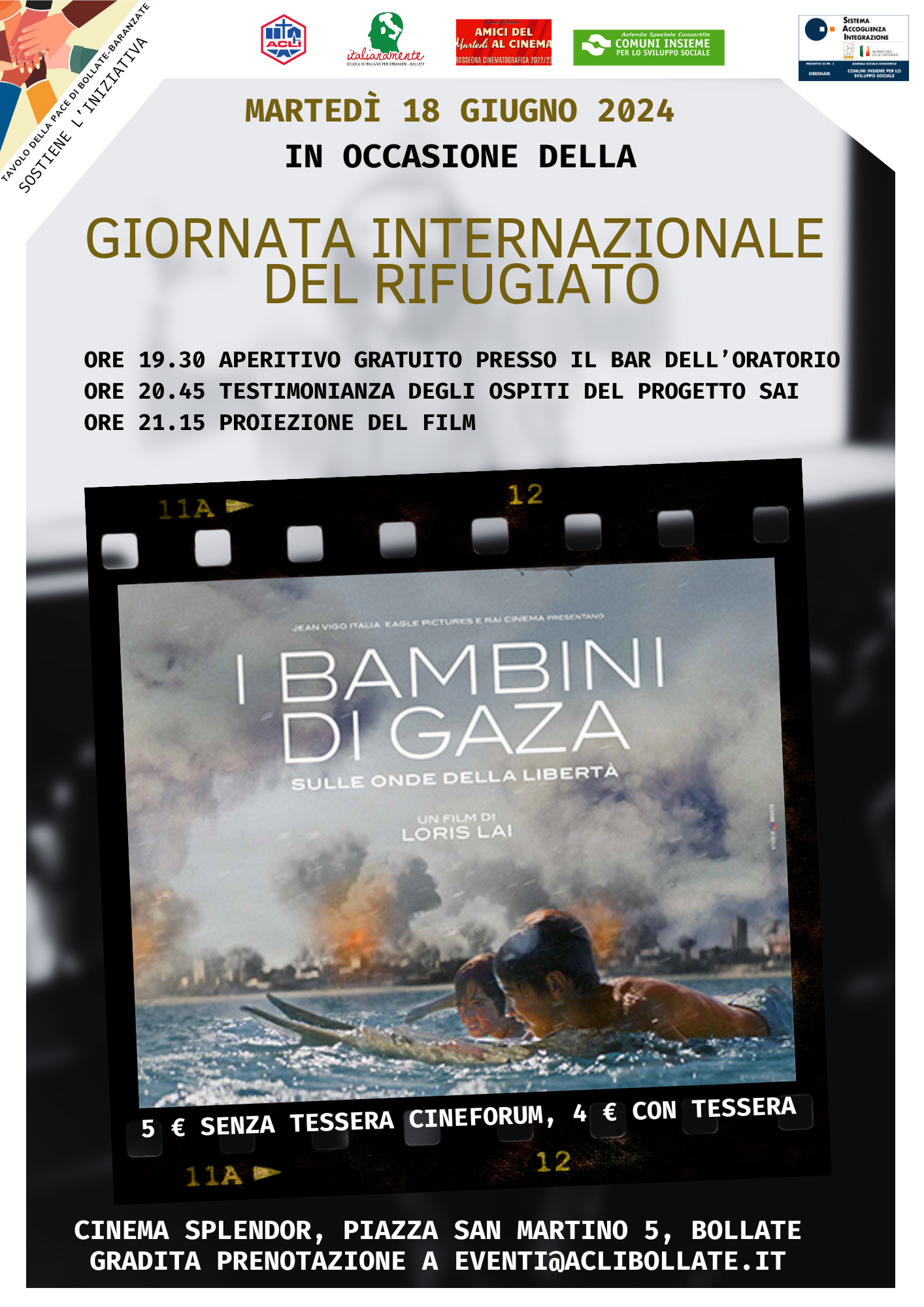 In occasione della Giornata internazionale del rifugiato, anche quest’anno il circolo ACLI di Bollate e la sua scuola di italiano organizzano, insieme agli amici del cineforum, un momento di riflessione collettiva su un tema così importante. In particolare, dopo una testimonianza preziosa di chi da rifugiato vive nei nostri territori, ci sposteremo a Gaza grazie a un film recente che ha ottenuto il plauso anche di Papa Francesco: “Questo film, con le voci piene di speranza dei bambini palestinesi e israeliani, sarà un grande contributo alla formazione nella fraternità, l’amicizia sociale e la pace“.
